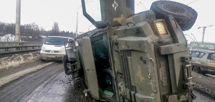В Киеве возле метро «Нивки» перевернулся военный бронеавтомобиль КрАЗ Cougar. Об этом сообщает издание «Информатор».