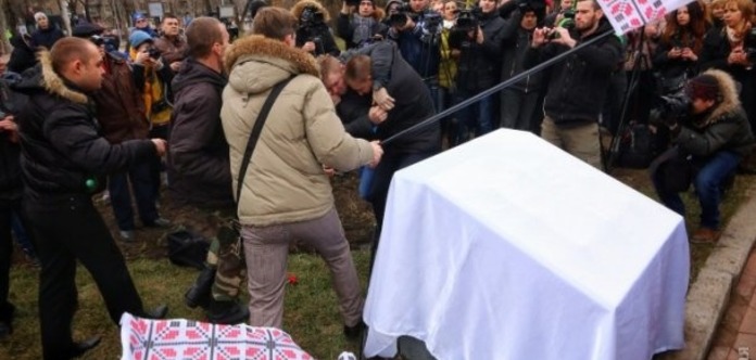 «После этого «свободовцы» потребовали от сторонников «Батькивщины» убрать партийные флаги от памятного знака, между сторонами завязалась драка», - резюмирует издание.